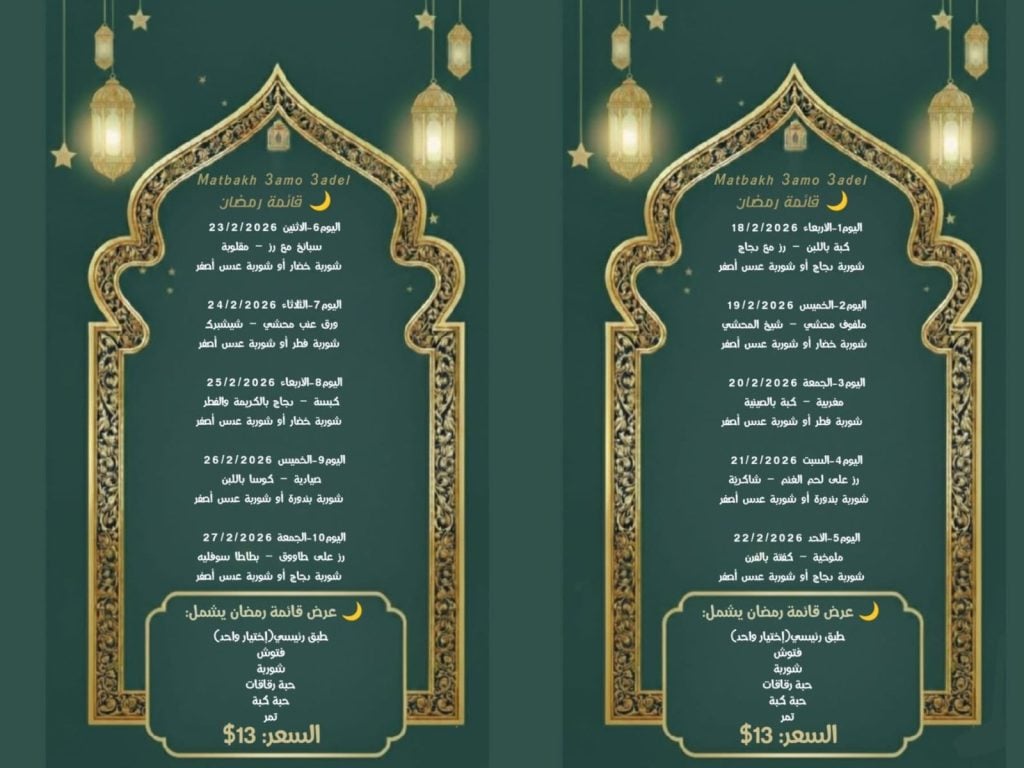 3amo 3adel has curated a schedule of Lebanese “greatest hits,” so you can plan your week around your favorites, which include kibbeh b laban, mloukhiye, kabseh, shish barak, ouzy, among other delightful dishes until the end of Ramadan.
