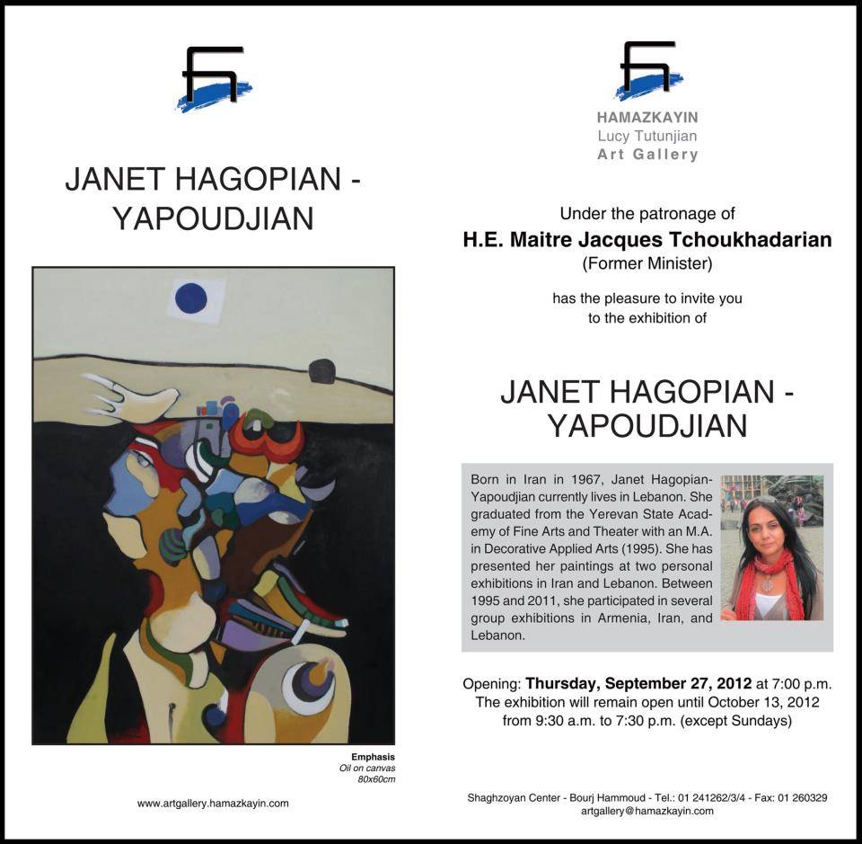 The Hamazkayin Lucy Tutunjin Art Gallery has the pleasure to invite you to an exhibition by artist Janet Hagopian-Yapoudjian. The artist will be exhibiting her paintings until October 13.